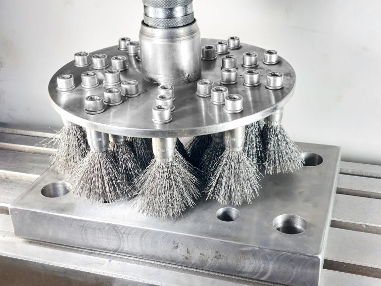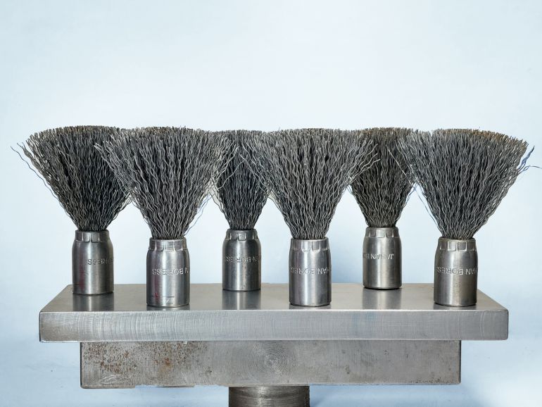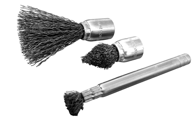 برسهای قلمی رزوهدار جهان برس با طراحی دقیق و ساختار مقاوم، برای انجام عملیات تخصصی و دسترسی به نواحی دشوار تولید میشوند. رشتهسیمها بهصورت فشرده درون بوش فلزی جایگذاری شدهاند تا از جدا شدن آنها در حین کار جلوگیری شود و دوام و تعادل مکانیکی برس حتی در سرعتهای بالا حفظ گردد.