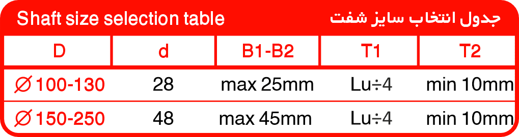 ﻫﻤﭽﻨﯿﻦ ﺑﺮای اﻧﺘﺨﺎب ﻧﻮع ﺑﺮس ﻣﺘﻨﺎﺳﺐ ﺑﺎ ﻗﻄﺮ ﺷﻔﺖ، ﺑﻪ ﮐﺎﺗﺎﻟﻮگ ﻣﺮاﺟﻌﻪ ﮐﺮده ﯾﺎ ﺑﺎ ﺷﺮﮐﺖ ﺗﻤﺎس ﺣﺎﺻﻞ ﻧﻤﺎﺪ. ﺑﺎ ﺗﻮﺟﻪ ﺑﻪ ﻗﻄﺮ ﺑﯿﺮوﻧﯽ ﺑﺮس و ﻃﻮل ﻣﺆﺛﺮ ﻣﯽﺗﻮاﻧﯿﺪ اﺑﻌﺎد ﻧﻬﺎﯾﯽ ﺷﻔﺖ را ﺑﺮ اﺳﺎس ﺟﺪول ﻣﺮﺑﻮﻃﻪ ﻣﺤﺎﺳﺒﻪ ﮐﺮده و ﻓﺮم ﺳﻔﺎرش را در ﺗﮑﻤﯿﻞ و ارﺳﺎل ﻧﻤﺎیید.
