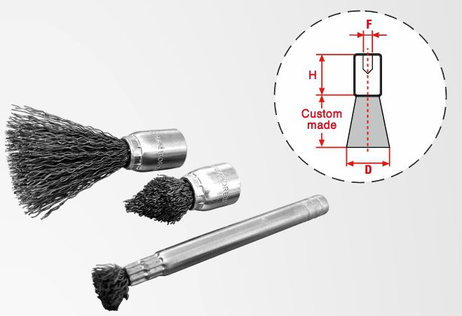 این برس‌ها از سه رشته سیم فشرده نورد شده تشکیل شده‌اند که به‌صورت مخروطی در جای فلزی قرار گرفته‌اند تا هنگام کار، از جدا شدن و افتادن جلوگیری شود و دوام و تعادل مکانیکی برس حفظ گردد — حتی در سرعت‌های بالا.