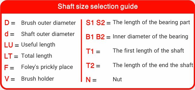 شفت: انتخاب بر اساس ابعاد درجشده در جدول فنی، شامل چوب مخصوص جای خار، قطر داخلی بلبرینگ، و قطر سر شفت برای تثبیت برسها