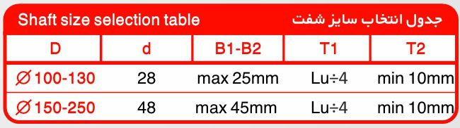 نکته مهم: برای تولید با قطرهای خاص خار، محدودیتهایی وجود دارد و باید قطر شفت مطابق با ابعاد درجشده در جدول فنی انتخاب شود. تولید خارج از این محدوده امکانپذیر نیست.
