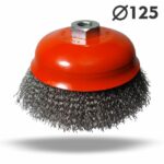 این نوع برس به شکل کاسه ای تولید شده و به لحاظ داشتن سیم های افشان شده ، یک برس انعطاف پذیر محسوب می شود و در سایز های استاندارد از قطر70 الی 125 میلی متر تولید و عرضه می گردد . برس های کاسه ای افشان در دو مدل مهره دار و دنباله دار هستند که مهره دار برای نصب بر روی دستگاه های قابل حمل ، مانند فرز دستی مینی و دنباله دار برای نصب بر روی دریل دستی مناسب می باشد. برس کاسه ای افشان به لحاظ قابلیت نصب بر روی و برای کار بر روی سطوح بزرگ و ثابت و زوایای غیر قابل دسترسی برس کاسه ای افشان طوقه دار ، تراکم رشته ای ، تهاجم و بار برداری بیشتری نسبت به برسهای کاسه ای افشان بدون طوقه دارد. همچنین این برس قابلیت جدا شدن طوقه از برس را دارد تا در صورت اتمام سیم ها حین کار، مجدد سیمی که در زیر طوقه قرار گرفته را میتوان مجدد از آن استفاده کرد.”